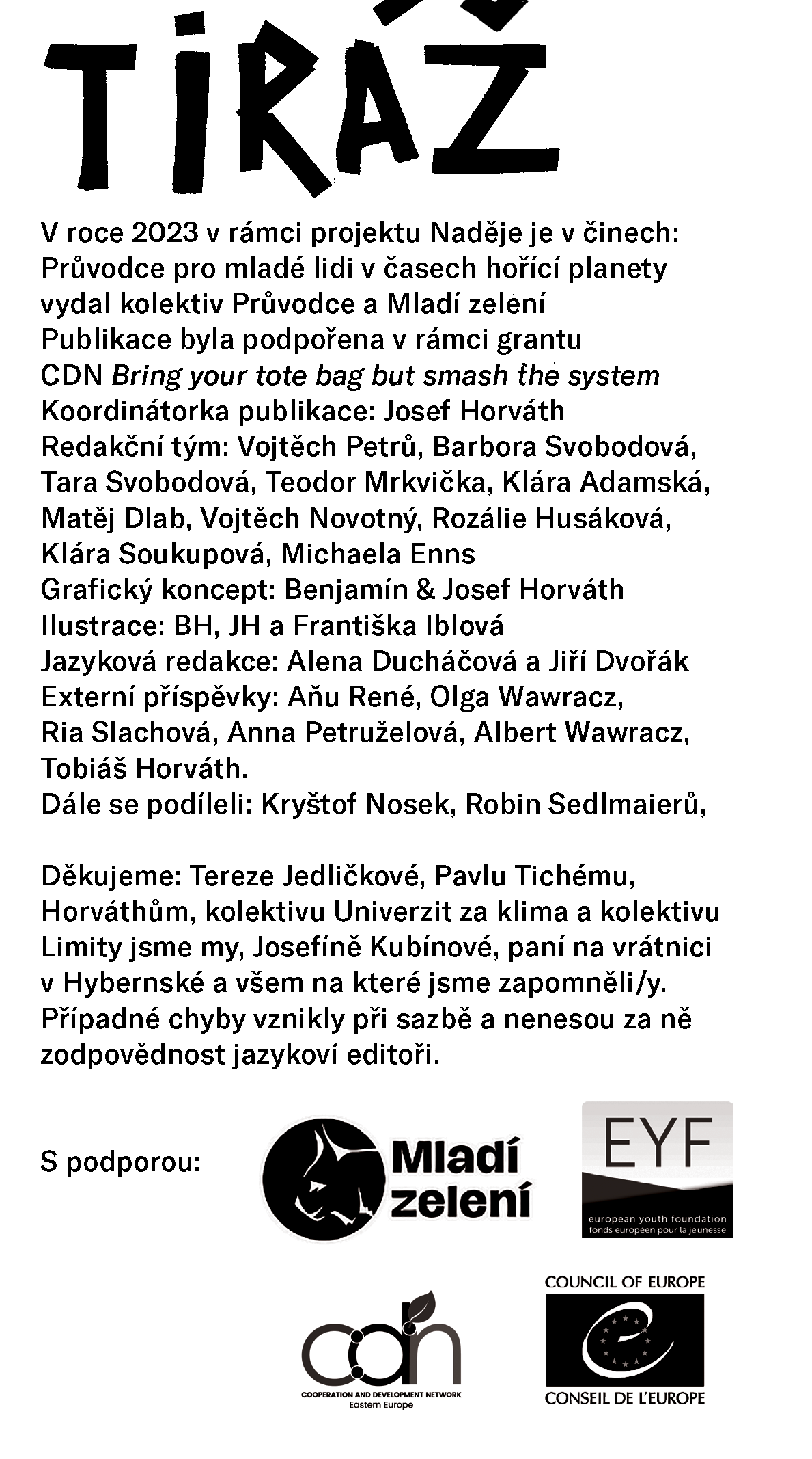 Mladí zelení a Kolektiv Průvodce vydalx v rámci projektu Naděje je v činech publikaci s názvem: Průvodce pro mladé lidi v časech hořící planety. Protože se více jak polovina mladých lidí potýká s pocitem smutku či úzkosti ze změn klimatu, rozhodlx jsme se zkusit propojit alespoň pár z nich, a to jak z různých českých aktivistických skupin, tak i mimo ně a vytvořit sborník článků (odborných či beletristických, popisující osobní zkušenost či tvořené příběhy jiných lidí) a výtvarných vstupů (ilustrace, fotografie) na téma klimatického žalu a jeho konstruktivního zpracování.