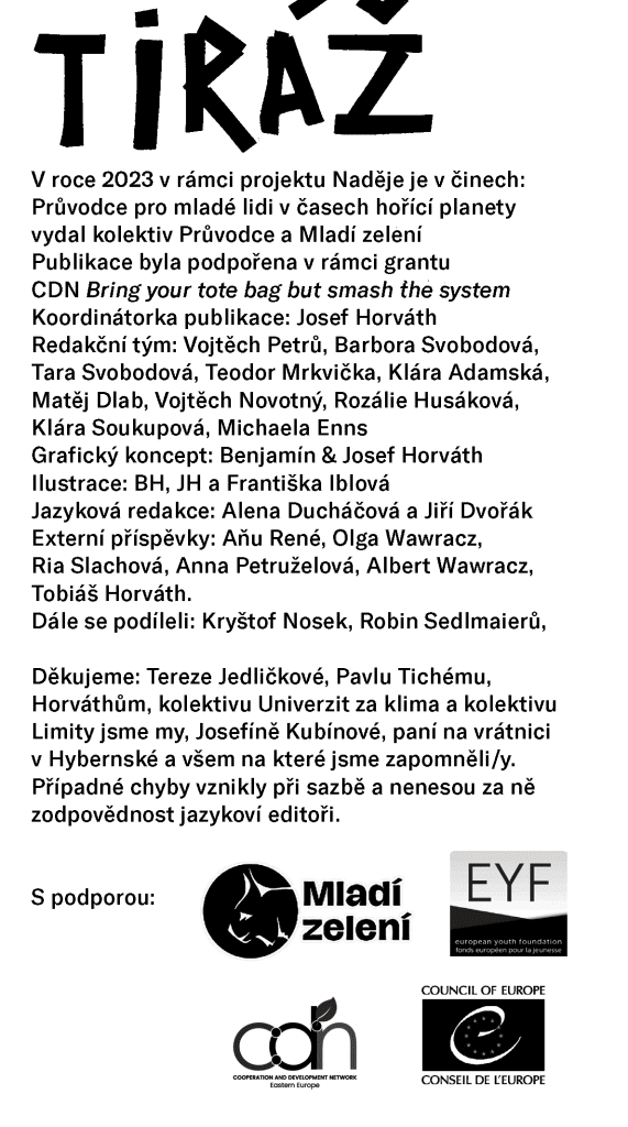 Summary: Young Greens and the Guide Collective have published a publication as part of the Naděje je v činech (Hope is in Action) project entitled: A Guide for Young People in the Times of a Burning Planet. It is a series of essays and texts that discuss grief, crisis, and other feelings related to climate change.